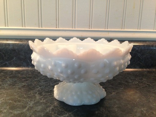 VINTAGE Milk Glass Fenton Hobnail Candle Footed Bowl