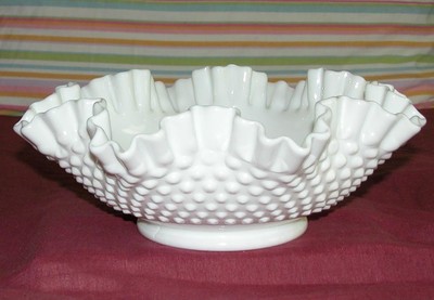 VINTAGE FENTON MILK GLASS HOBNAIL RUFFLED CRIMPED BOWL