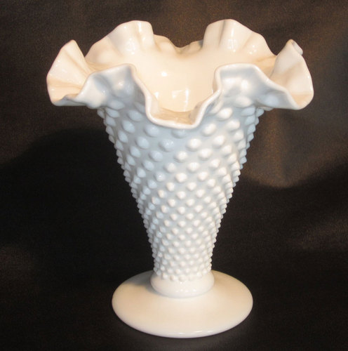 Title (ebay affiliate link): 8" VINTAGE FLUTED ART GLASS FAN VASE MILK WHITE HOBNAIL RUFFLED RIM HEAVY MINT