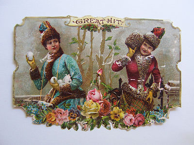 Title (ebay affiliate link): VICTORIAN PAPER SCRAP * LADIES SNOWBALL FIGHT * TRIMMED CIGAR LABEL