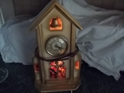Title (ebay affiliate link): Sessions Mantle Clock Church with light and colored windows