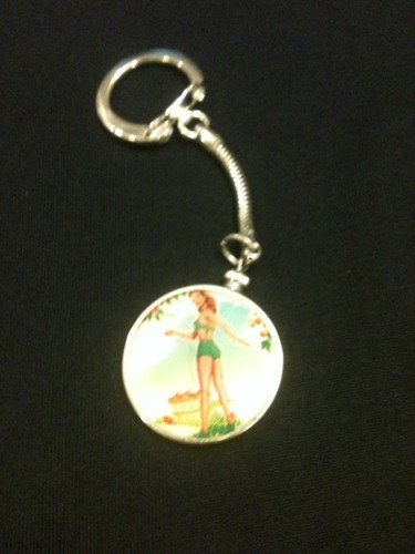 Vintage Key Ring Fob Pretty Girl Picking Apples