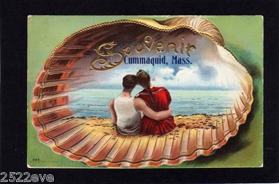 Title (ebay affiliate link): Cummaquid, MA- Embossed Shell Souvenier card with two people
