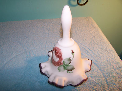 Fenton , Hand Painted milk / Satin Glass , Bell with Amethyst Crest, Signed