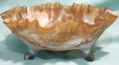 VTG 1950's IMPERIAL CARAMEL & MILK GLASS SATIN THREE TOED OPEN ROSE RUFFLED BOWL