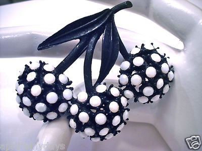 VINTAGE UNIQUE RARE MILK GLASS rhinestones JAPANNED BLACK CHERRIES brooch/pin
