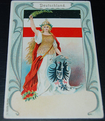 Title (ebay affiliate link): 1900`s Victorian Trade Card FLAG / CREAST / COUNTRY /COSTUME - GERMANY GERMANIA