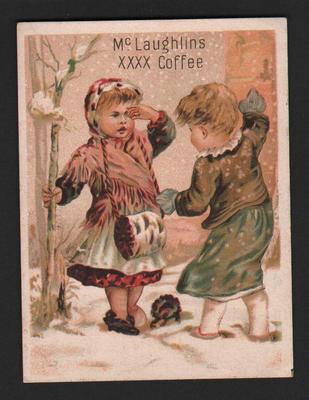 Title (ebay affiliate link): 1890s ADVERTISING TRADE CARD MCLAUGHLINS COFFEE CHICAGO KIDS IN SNOW