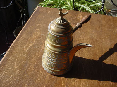 Title (ebay affiliate link): Antique Turkish Brass Copper Coffee Tea Pot w/Wooden Handle Bird Carving Fancy!