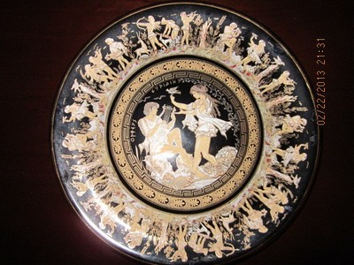 HAND PAINTED FIGURAL NEOCLASSICAL GREEK PLATE WITH 24K GOLD INLAYS