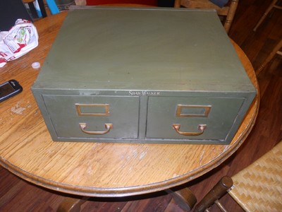 Title (ebay affiliate link): Vintage Shaw Walker two drawer metal file cabinet, brass handles, dividers