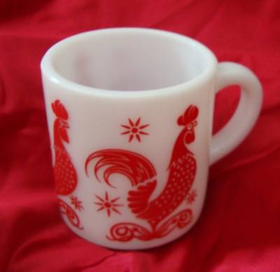 VTG HAZEL ATLAS RED ROOSTER WHITE MILK GLASS MUG CUP
