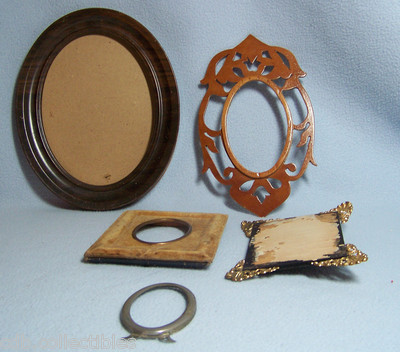 Antique small picture Frames: wood, tin, velvet on wood-- 5 frames