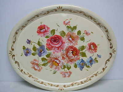 ANTIQUE LARGE HAND PAINTED TOLEWARE TRAY WITH FLOWERS 25 X 20