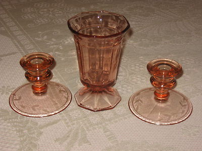 Title (ebay affiliate link): Vintage Pink Depression Glass Vase & 2 Candle Holders Excellent Condition