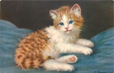 Title (ebay affiliate link): A Lampe~Fluffy Tabby Cat on Blue Blanket~Bright Blue Eyes~Paw Up~#169~Artist