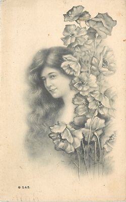 Title (ebay affiliate link): Dixon~Fantasy: Lovely Lady Face in Poppies~Long Wavy Hair~G&B 1912 Sepia PC