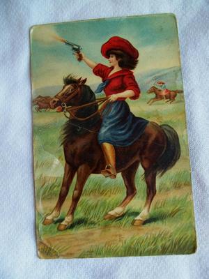Title (ebay affiliate link): Cowgirl Shoots gun Girl Horse Pony wild west antique Postcard Langsdorf Old art