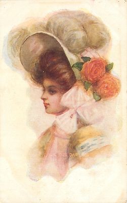 Title (ebay affiliate link): Pretty Lady in Enormous Feather Hat~Red Peach Roses~Big Bow Tie~"Our Darling"