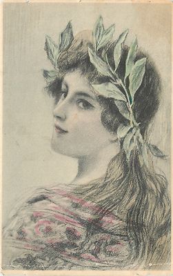 Title (ebay affiliate link): Lovely Lady Looks Back Over Shoulder~Laurel Leaves in Hair~Flower Top~1905 HC