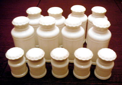 13 Antique Opaque Milk Glass Spice Jars Set - MINT