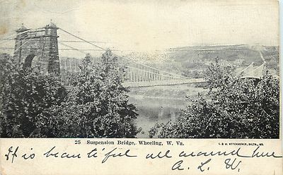 Title (ebay affiliate link): Wheeling West Virginia~Suspension Bridge~Stone Towers~Hilltop Tree View~1907 PC