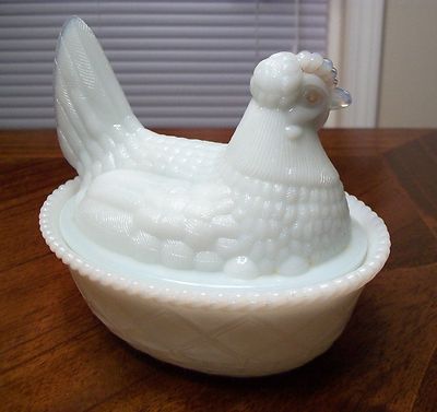 Title (ebay affiliate link): Old Vintage Milk Glass Hen on Nest Candy/Trinket Dish Bluish Cast - Nice Detail