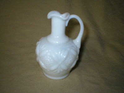Title (ebay affiliate link): Antique Milk Glass Pitcher With Blown Out Pattern & Applied Handle Nice Glow