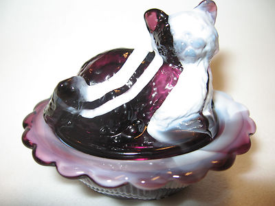 Title (ebay affiliate link): Amethyst purple & milk slag glass salt celt cat kitten kitty on nest basket dish