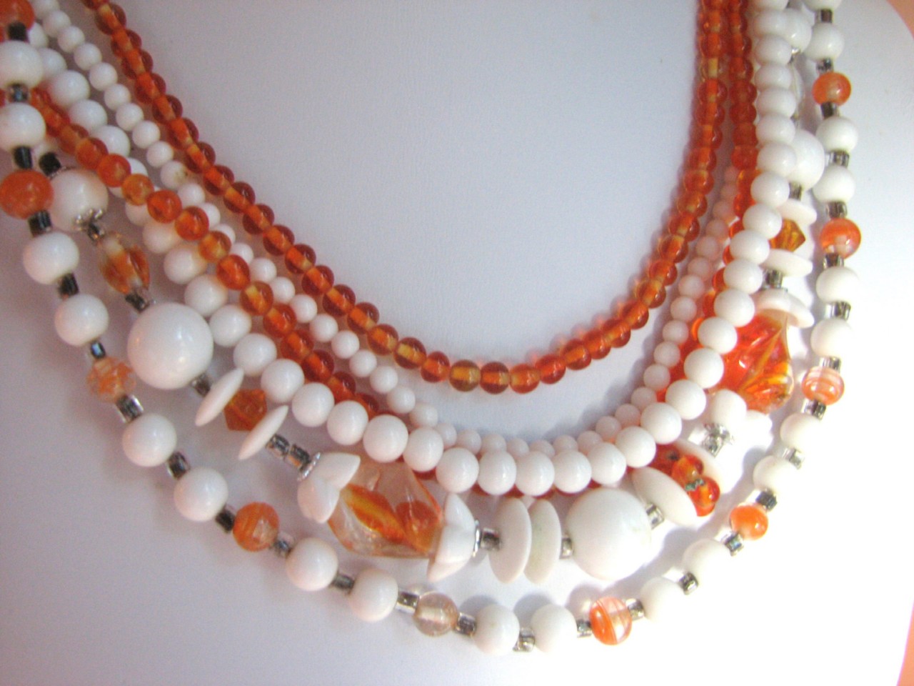 Vintage Milk Glass & Orange Bead Multistrand Necklace