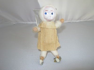 ANTIQUE CHRISTMAS ORNAMENT, SPUN COTTON LITTLE GIRL ON SKATES, CRETE PAPER DRESS