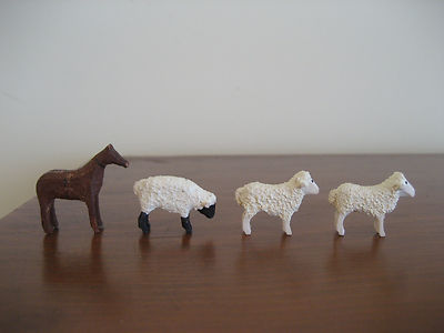 Title (ebay affiliate link): 3 Tiny vintage wooden sheep for miniature nativity farm Erzgebirge Putz + horse
