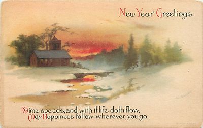 Title (ebay affiliate link): Ellen H Clapsaddle~New Year Greetings~Snowy Creek~Bridge~Church in Twilight~1918