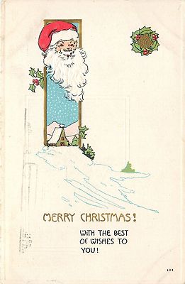 Title (ebay affiliate link): Santa Claus~Face in Snowy Blue Sky Window~Art Deco~Gold House~Wreath~White Embos
