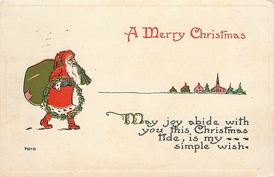 Title (ebay affiliate link): Santa Claus~Long Robe~Ermine Fur~Patched Gift Bag~Walks to Village~Emboss~1915