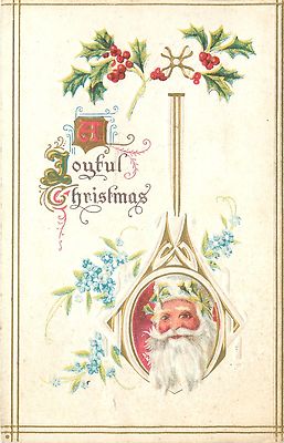 Santa Claus Face on Gold White Emboss Ornament~Holly Leaf Hat Wreath~1916 PC
