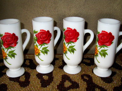 Title (ebay affiliate link): Vintage AVON Set/4 Milk Glass Red Rose Floral 5" x 2" Pedistal Mugs/Cups/Latte'