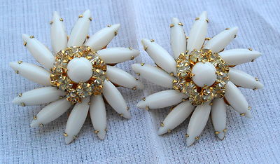 Title (ebay affiliate link): VINTAGE JUDY LEE MILK GLASS PINWHEEL STONES / CLEAR RHINESTONE SUNBURST EARRINGS