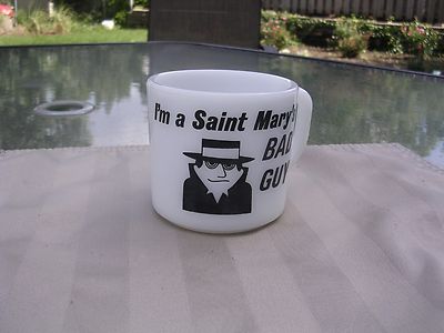 Anchor Hocking milk glass Bad Guy d handle Saint Mary's coffee mug