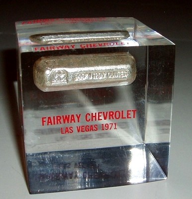 Title (ebay affiliate link): 1971 Fairway Chevrolet Paperweight Las Vegas w/ 1oz SILVER INGOT Corvette Camaro