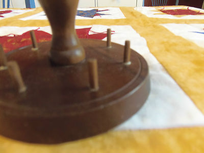 Title (ebay affiliate link): Vintage Wood Spool Caddy with Pin Cushion Sewing Accessories Holder