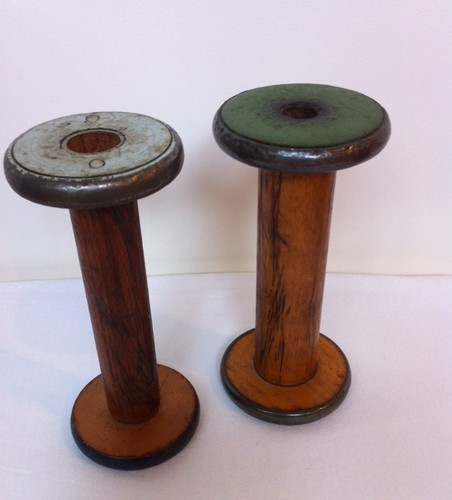 Title (ebay affiliate link): LOT OF 2 VINTAGE TEXTILE MILL BOBBIN SPOOLS - 7" WOOD AND CHROME