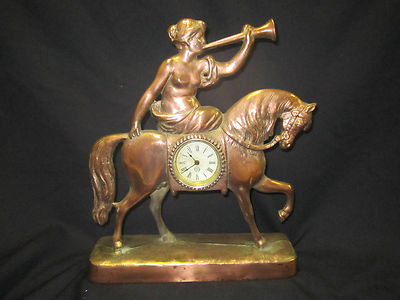 Title (ebay affiliate link): ANTIQUE GOLDEN NOVELTY METAL MANTEL/SHELF CLOCK LADY GODIVA ON HORSE COPPER