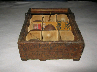 Title (ebay affiliate link): ANTIQUE PRIMITIVE STAR EGG CARRIER AND TRAY WOODEN EGG CARRIER JOHN G. ELBS
