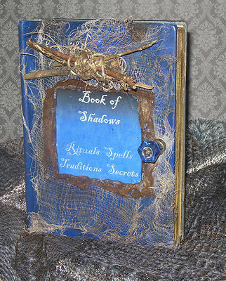 Title (ebay affiliate link): Primitive Halloween Witch BOOK * Mixed Media Art *Vintage Wicca Spells *BLUE