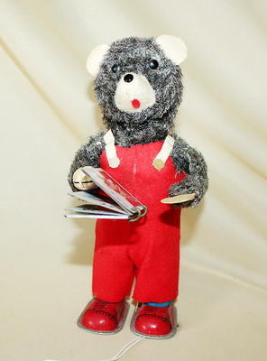 Title (ebay affiliate link): Antique Japan Wind-Up Tin Toy Bear w/Fur, Reads & Turns Book Pages Works