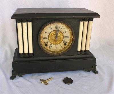 Title (ebay affiliate link): Vintage Ingraham 8 Day Black Mantle Shelf Clock Working 6 Column Antique Wooden