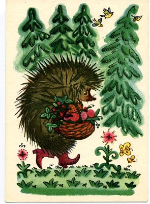 Title (ebay affiliate link): 1968 Hedgehog w/ Basket Bird Butterfly Flower Forest USSR Soviet old pc