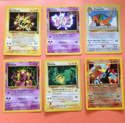 Title (ebay affiliate link): Pokemon Promo Card Lot: Mewtwo, Dragonite, Pikachu, Entei, Electabuzz