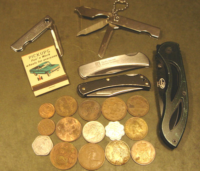 Title (ebay affiliate link): Junk Drawer Lot Lockback Knife Keychain Mixed World Coin Truck Matchbook Vtg Old